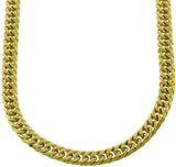 Made with 14K Yellow Gold finish over Stainless Steel. The necklace is a Solid, Heavy. The piece featured here is made with cuban style, thick links. Hypoallergenic stainless steel.